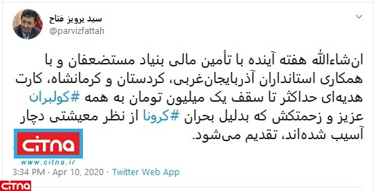 انشاءالله هفته آینده با تأمین مالی بنیاد مستضعفان و با همکارى استانداران آذربایجانغربی، کردستان و کرمانشاه، کارت هدیهاى حداکثر تا سقف یک میلیون تومان به همه #کولبران عزیز و زحمتکش که بدلیل بحران #کرونا از نظر معیشتی دچار آسیب شدهاند، تقدیم میشود.