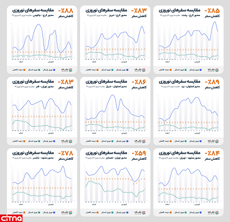 نشان بررسی سفرهای بین شهری را از ۲۳ اسفند آغاز کرد. در این نمودار، مقایسهی سفرهای بینشهری در نوروز ۹۸ با نوروز ۹۹ نمایش داده شده است.
