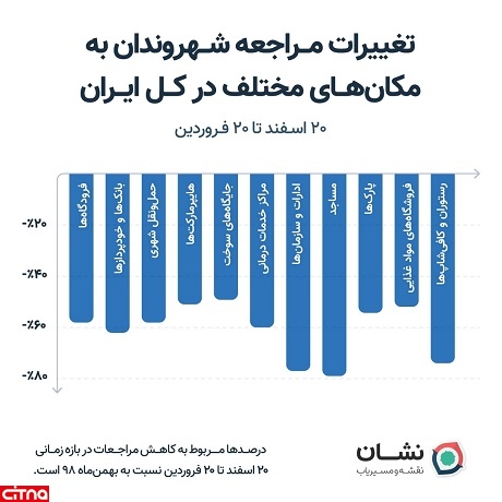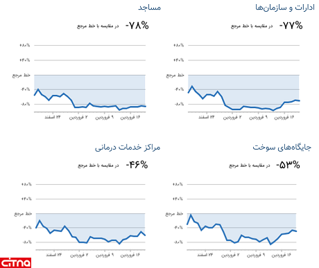 بر اساس این اطلاعات، مراجعه به جایگاههای سوخت در سراسر ایران، کمترین کاهش را داشته است. در واقع تعداد مراجعه کاربران نشان به پمپ بنزینها تنها ۴۹ درصد کاهش داشته است. از سوی دیگر به علت شیوع کرونا، مساجد ۷۹ درصد کاهش مراجعه داشتهاند.