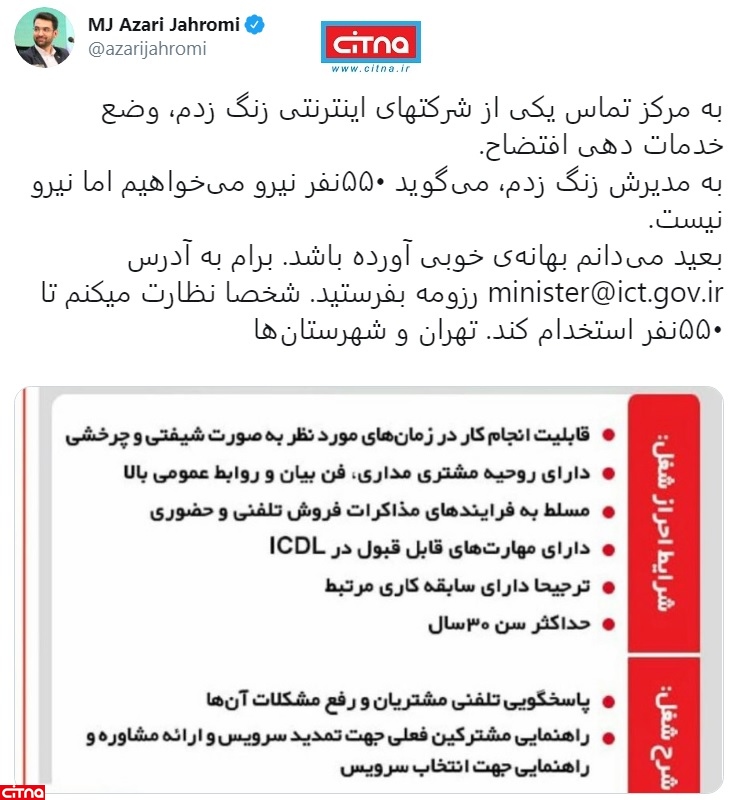 بعید می‌دانم بهانه‌ی خوبی آورده باشد. برام به آدرس minister@ict.gov.ir رزومه بفرستید. شخصا نظارت میکنم تا ۵۵۰ نفر استخدام کند. تهران و شهرستان‌ها