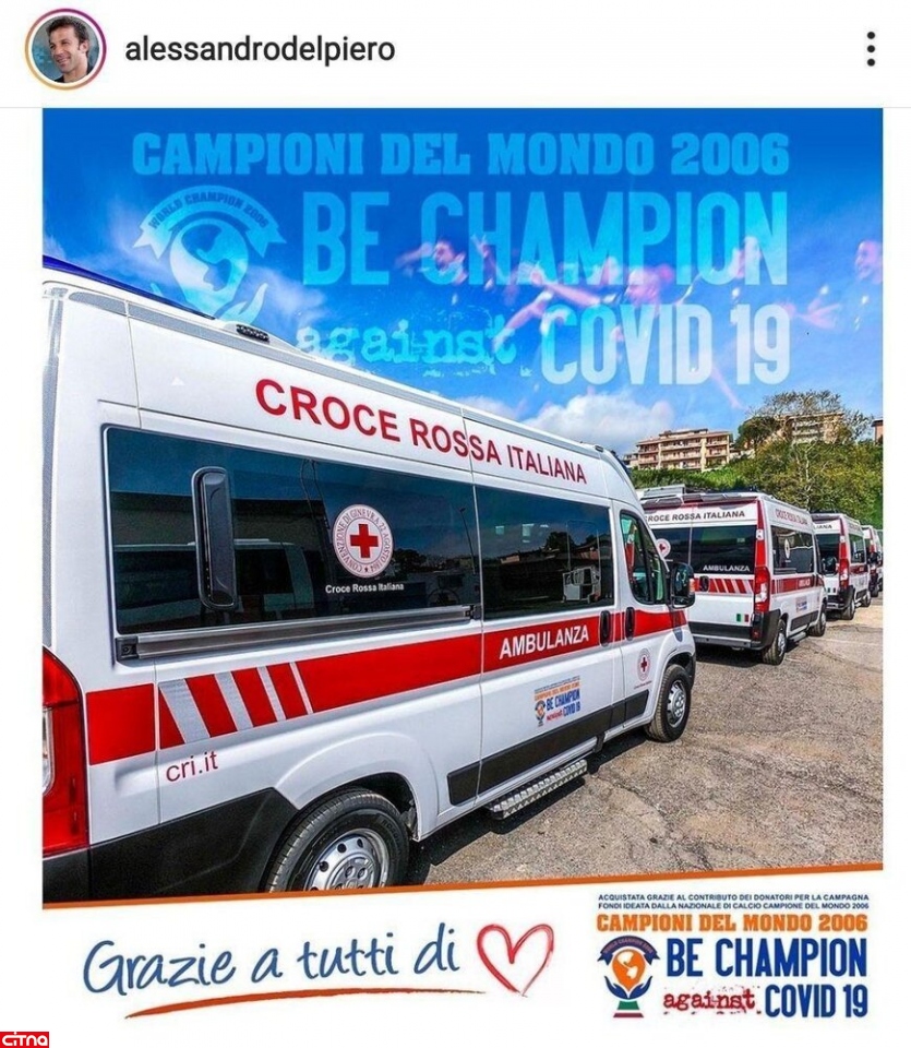 به گزارش سرویس وبگردی سیتنا، در ادامه اقدامات قابل تقدیر اهالی ورزش در کشورهای مختلف برای مقابله با بیماری کرونا الکس دل پیرو با انتشار پستی در اینستاگرام، از اهدای چهار آمبولانس کاملا مجهز توسط تیم ملی ایتالیای قهرمان جام جهانی 2006 به کادر درمان ایتالیا با شعار "قهرمانان 2006 در برابر کرونا" خبر داد. دل پیرو عضوی از تیم قهرمان ایتالیا در جام جهانی 2006 آلمان بود.