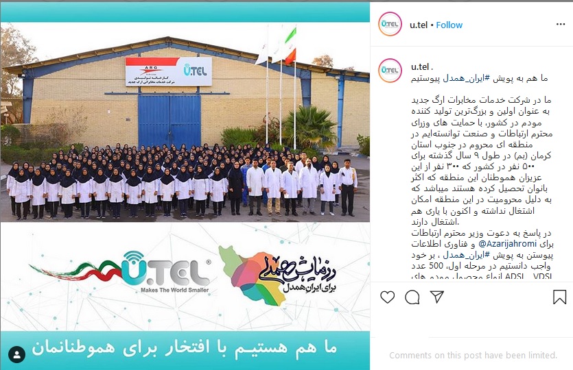 در پاسخ به دعوت وزیر محترم ارتباطات و فناوری اطلاعات @Azarijahromi برای پیوستن به پویش #ایران_همدل ، بر خود واجب دانستیم در مرحله اول، ۵۰۰ عدد انواع محصول مودم های ADSL , VDSL و LTE مورد نیاز برای ارتباط دانش آموزان عزیز مناطق محروم جنوب استان کرمان را تقدیم نماییم.