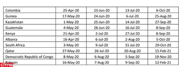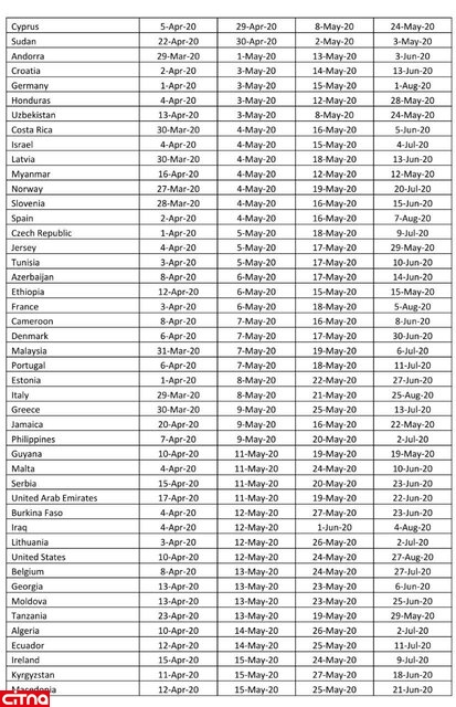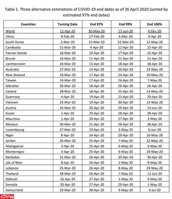جدول یک، سه تاریخ را برای پایان یافتن کووید- ۱۹ در ۱۳۱ کشور نشان میدهد.