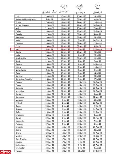 این پژوهشگران مدعی شدهاند، زمان پایان ۹۷ درصدی کووید-۱۹ در ایران ۲۰ می(۳۱ اردیبهشت)، پایان ۹۹ درصدی ۹ ژوئن(۲۰ خرداد) و پایان ۱۰۰ درصد آن ۲۲ اکتبر(اول آبان) خواهد بود.