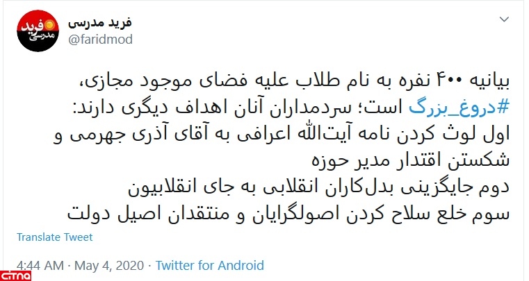 به گزارش سیتنا، فرید مدرسی روزنامهنگار و پژوهشگر حوزه دین و اندیشه توییتی را در حساب کاربری خود منتشر کرد و در آن بیانیه ۴۰۰ نفرهای که گفته میشود طلاب برای مقابله با فضای موجود مجازی منتشر کردهاند، دروغی بزرگ خواند.