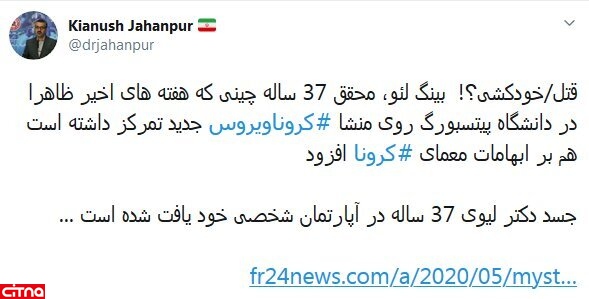 به گزارش سرویس وبگردی سیتنا، کیانوش جهانپور در حساب توییتری خود نوشت: «قتل/خودکشی!؟ بینگ لئو، محقق ۳۷ ساله چینی که هفتههای اخیر ظاهرا در دانشگاه پیتسبورگ روی منشا #کروناویروس جدید تمرکز داشته است هم بر ابهامات معمای #کرونا افزود.