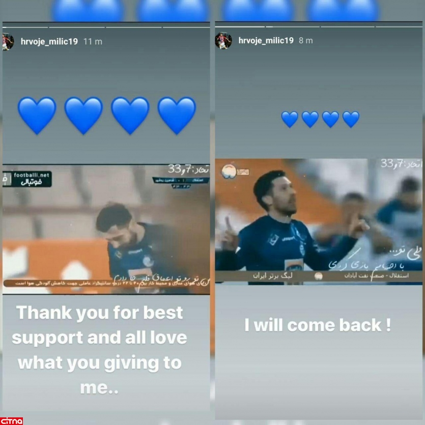 به گزارش سرویس وبگردی سیتنا، هروویه میلیچ مدافع چپ اهل کرواسی تیم استقلال تهران با انتشار دو استوری در اینستاگرام خود نوشت: «تشکر بابت بهترین حمایت و تمام عشقی که به من میدهید. من برمیگردم!»