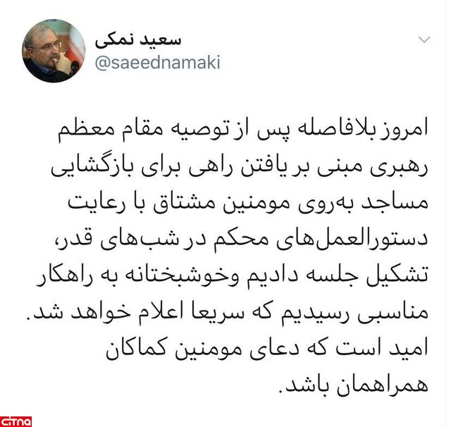 "امروز بلافاصله پس از توصیه مقام معظم رهبری مبنیبر یافتن راهی برای بازگشایی مساجد بهروی مومنین مشتاق با رعایت دستورالعملهای محکم در شبهای قدر، تشکیل جلسه دادیم و خوشبختانه به راهکار مناسبی رسیدیم که سریعا اعلام خواهد شد.