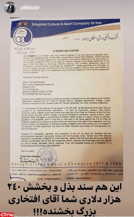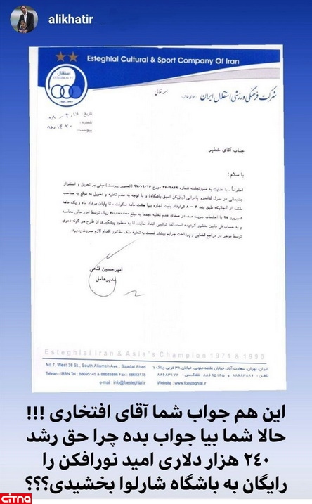 علی خطیر معاون ورزشی سابق استقلال در خصوص موضوعات و حواشی مطرح شده اسنادی را در فضای مجازی منتشر کرد.