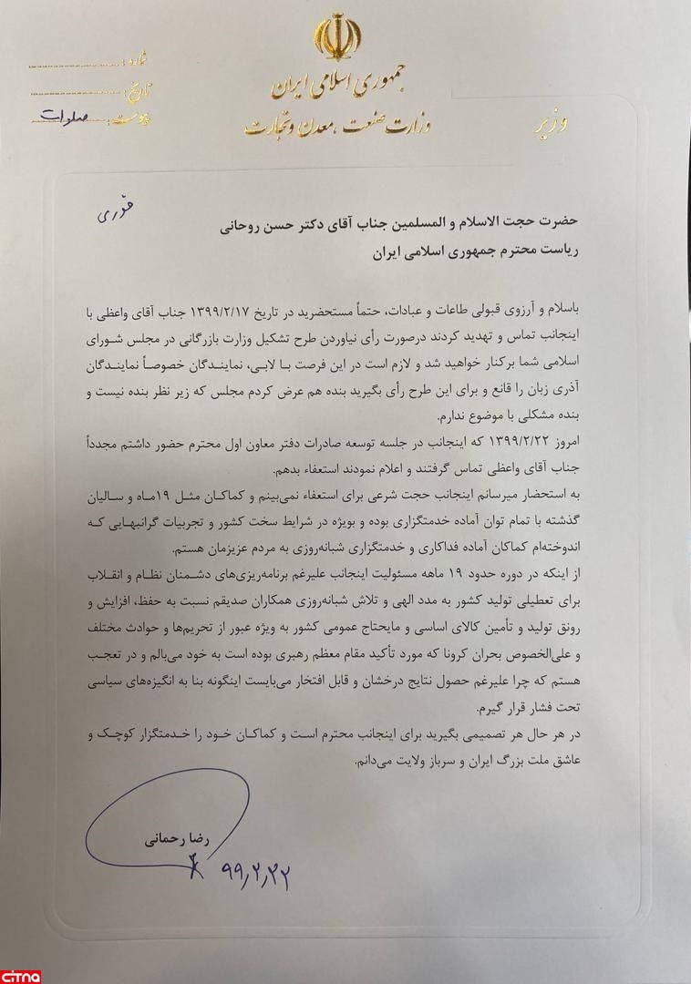 امروز 1399/2/22 که اینجانب در جلسه توسعه صادرات دفتر معاون اول محترم حضور داشتم مجدداً جناب آقای واعظی تماس گرفتند و اعلام نمودند استعفا بدهم.