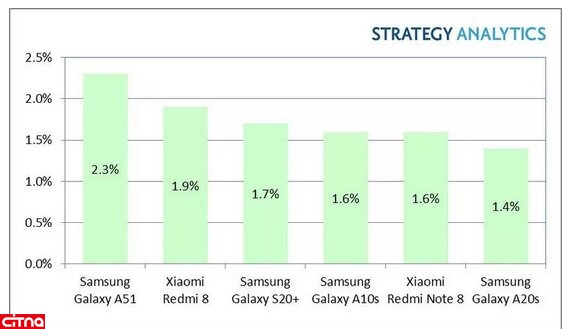 رتبههای چهارم تا ششم این فهرست نیز به ترتیب گوشیهای گلکسی A10s سامسونگ و شیائومی ردمی نوت ۸ با سهمی ۱.۶ درصدی و گلکسی A۲۰s سامسونگ با سهمی ۱.۴ درصدی بوده اند.