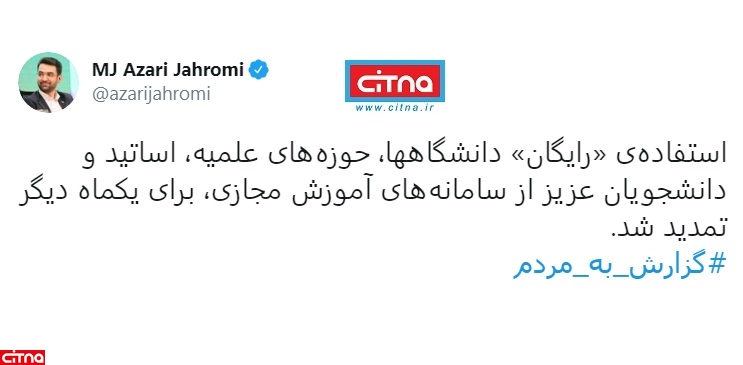 وزیر ارتباطات، خبر داد: تمدید یک ماهی استفادهی «رایگان» دانشگاهها، حوزههای علمیه، اساتید و دانشجویان از سامانههای آموزش مجازی