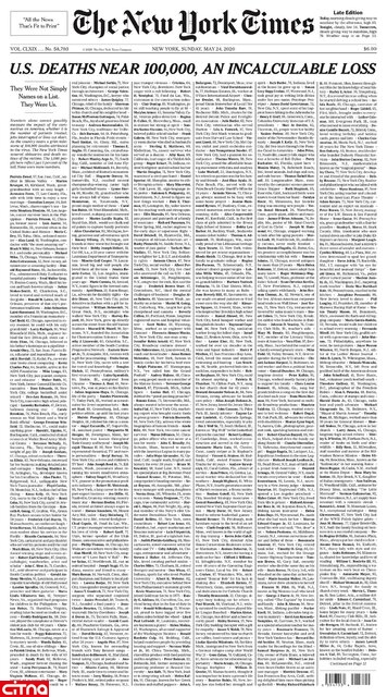 به گزارش سیتنا، نیویورک تایمز در شماره روز یکشنبه (۲۴ می) خود به بهانه رسیدن شمار قربانیان ویروس کرونا در آمریکا به مرز ۱۰۰ هزار نفر به جای استفاده از مقاله، عکس و یا طرحهای گرافیکی و برای یادآورشدن این حقیقت تلخ، فهرستی از نام ۱۰۰۰ جانباخته این بیماری همهگیر را در صفحه نخست خود قرار داد.