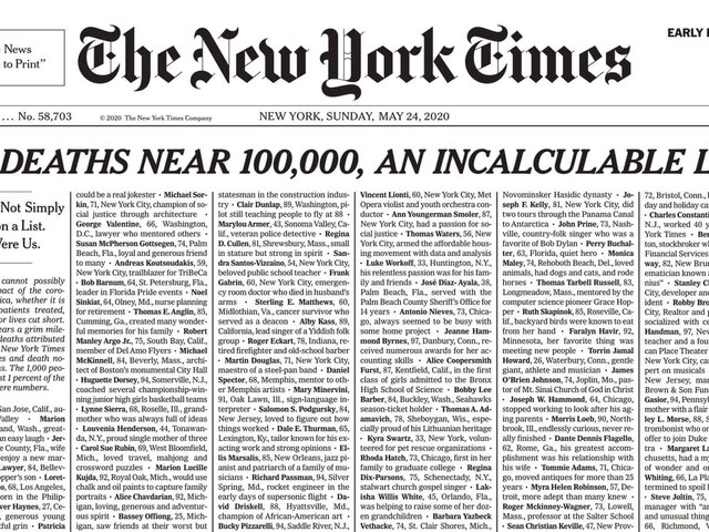 با رسیدن مجموع قربانیان ویروس کرونا در آمریکا به ۱۰۰ هزار نفر، روزنامه نیویورک تایمز در صفحه نخست جدیدترین شماره خود طرحی شامل آگهی مرگ هزار قربانی این ویروس قرار داد.