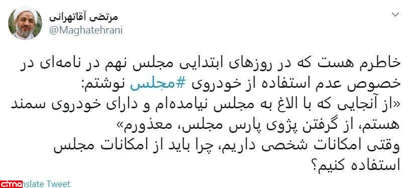 به گزارش سرویس وبگردی سیتنا، مرتضی آقاتهرانی، منتخب مردم تهران در مجلس یازدهم، در توئیتی با هشتگ مجلس نوشت: خاطرم هست که در روزهای ابتدایی مجلس نهم در نامه ای در خصوص عدم استفاده از خودروی مجلس نوشتم: