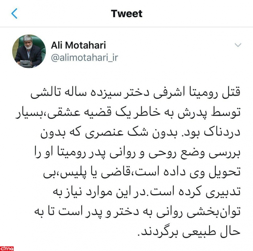 توییت علی مطهری در واکنش به قتل فجیع رومینا اشرفی توسط پدرش