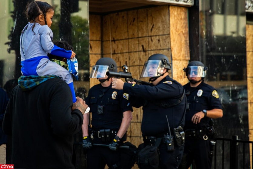 به گزارش سیتنا به نقل از سان، تصویر زیر مردی را نشان می دهد که در جریان اعتراضات به قتل جورج فلوید سیاه پوست آمریکایی کودک خود را بر روی شانه هایش نشانده است.در همین حال پلیس نیز با اسلحه گلوله پلاستیکی به سمت کودک نشانه می گیرد.