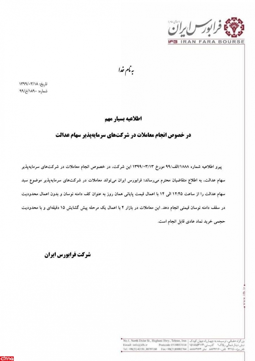 بر این اساس، معاملات پرتفوی سهام عدالت از ساعت ۱۲:۴۵ تا ۱۴ با اعمال قیمت پایانی همان روز به عنوان کف دامنه نوسان و بدون اعمال محدودیت در سقف دامنه نوسان قیمتی انجام میشود.
