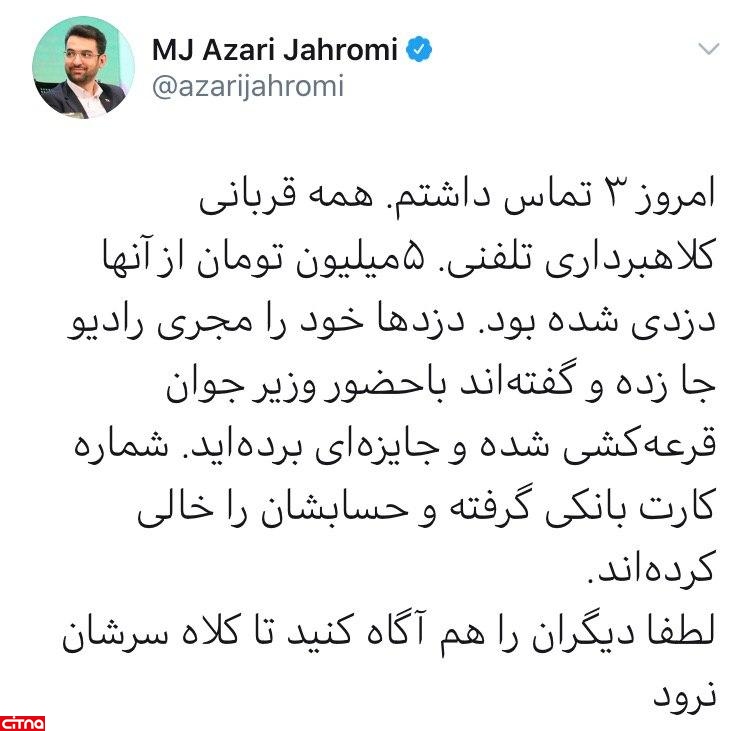 توئیت آذری جهرمی پیرامون ادامهی کلاهبرداریهای تلفنی با سوء استفاده از نام وزیر جوان