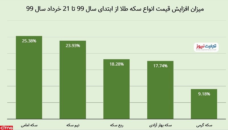 قیمت سکه امامی از ابتدای سال جاری تا ۲۱ خرداد ماه امسال با ۲۵٫۳۸ درصد رشد از شش میلیون تومان به ۷٫۵ میلیون تومان رسیده و بیشترین افزایش قیمت را در میان انواع سکه کسب کرده است.