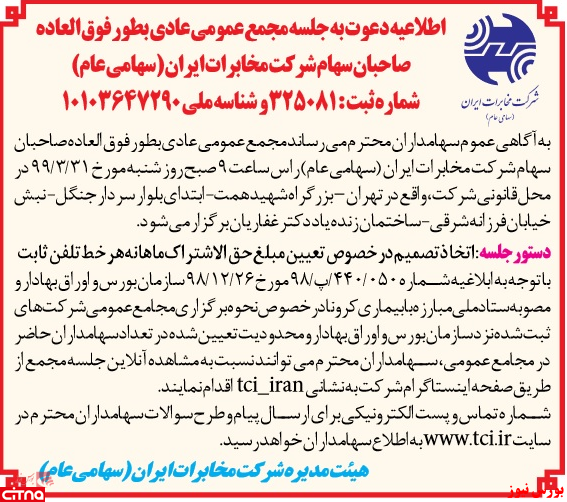 پیشتر شرکت مخابرات ایران در اطلاعیهای اعلام کرده بود: از کلیه سهامداران، وکیل یا قائم مقام قانونی صاحب سهم و همچنین نماینده یا نمایندگان اشخاص حقوقی دعوت میشود تا در جلسه مجمع عمومی این شرکت که در ساعت ۹:۰۰ روز شنبه مورخ ۱۳۹۹/۰۳/۳۱ در استان تهران، شهر تهران به آدرس تهران، بزرگراه شهید همت، ابتدای بلوار سردار جنگل، نبش خیابان فرزانه شرقی، ساختمان زنده یاد دکتر غفاریان حضور بهم رسانند.