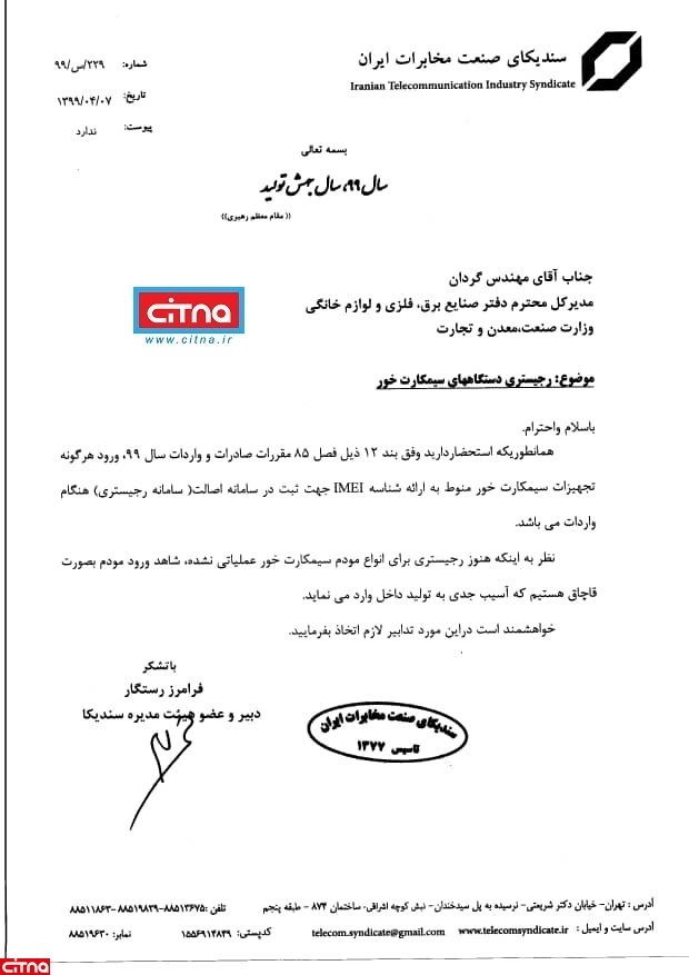 به گزارش خبرنگار سیتنا، مهندس فرامرز رستگار، دبیر و عضو هیات مدیره سندیکای صنعت مخابرات ایران در نامه ای با موضوع رجیستری دستگاههای سیمکارت خور، خطاب به وزارت صنعت، معدن و تجارت، تاکید کرد: