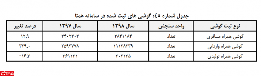 همچنین واردات گوشی همراه در سال گذشته بیش از چهار برابر شده، به طوریکه در سال 1397 و 1398 به ترتیب حدود دو میلیون و ۵۹۴ هزار و ۱۱ میلیون و ۱۲۸ هزار گوشی همراه وارداتی در سامانه همتا ثبت شده که حاکی از افزایش ۳۲۹ درصدی ثبت گوشی همراه وارداتی است.