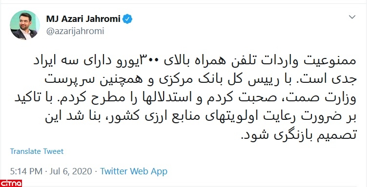 ممنوعیت واردات تلفن همراه بالای ۳۰۰یورو دارای سه ایراد جدی است. با رییس کل بانک مرکزی و همچنین سرپرست وزارت صمت، صحبت کردم و استدلالها را مطرح کردم. با تاکید بر ضرورت رعایت اولویتهای منابع ارزی کشور، بنا شد این تصمیم بازنگری شود.