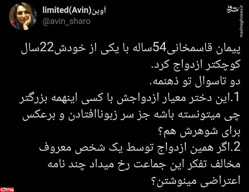 مشرق به نقل از یک کاربر فضای مجازی در توییترش نوشت: پیمان قاسمخانی 54 ساله با یکی از خودش 22 سال کوچکتر ازدواج کرد.