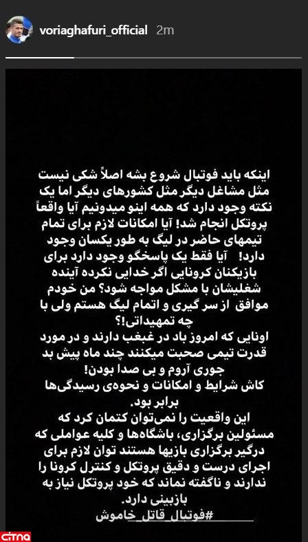 غفوری که به اظهار نظرات صریح پیرامون مسائل روز فوتبال ایران مشهور است در جدیدترین استوری اینستاگرامش اعلام کرد شرایط پیاده سازی پروتکلهای بهداشتی در فوتبال برای تمام تیمهای یکسان نیست در حالیکه همین پروتکلها باید بازبینی شوند. او در پایان پیامش از هشتگ «فوتبال قاتل خاموش» استفاده کرد.