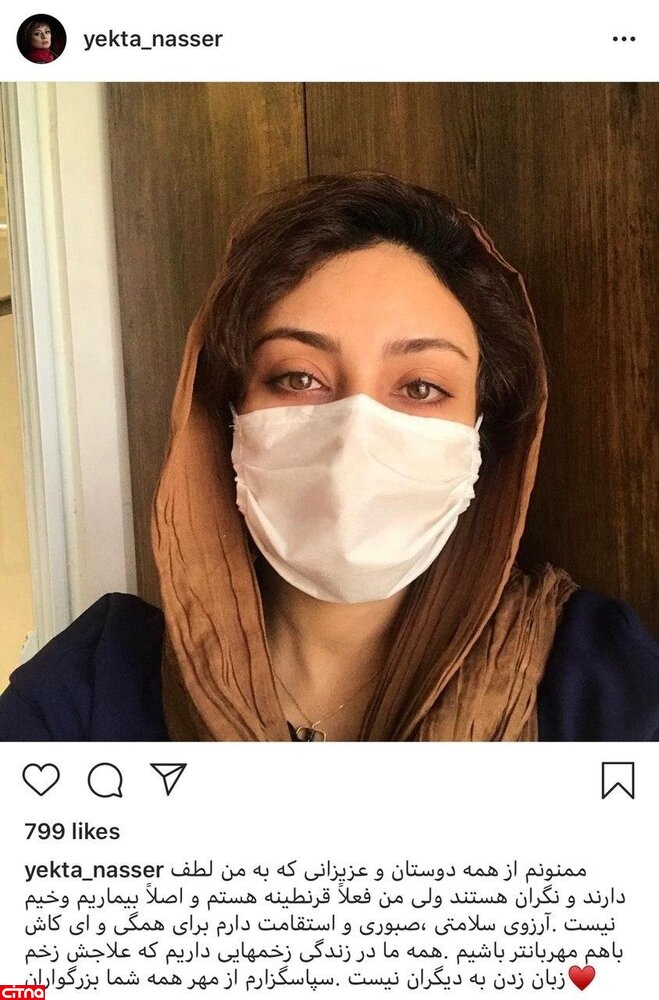 «ممنونم از همه دوستان و عزیزانی که به من لطف دارند و نگران هستند ولی من فعلاً قرنطینه هستم و اصلاً بیماریم وخیم نیست. آرزوی سلامتی، صبوری و استقامت دارم برای همگی و ای کاش باهم مهربانتر باشیم. همه ما در زندگی زخمهایی داریم که علاجش زخم زبان زدن به دیگران نیست. سپاسگزارم از مهر همه شما بزرگواران.»