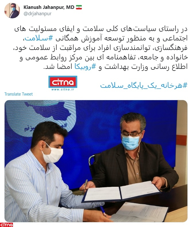 در راستای سیاستهای کلی سلامت و ایفای مسئولیت های اجتماعی و به منظور توسعه آموزش همگانی سلامت، فرهنگسازی، توانمندسازی افراد برای مراقبت از سلامت خود، خانواده و جامعه، تفاهمنامه ای بین مرکز روابط عمومی و اطلاع رسانی وزارت بهداشت و روبیکا امضا شد.
