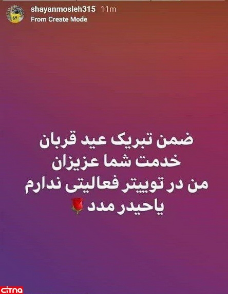 ساعاتی پس از انتشار خبر محرومیت، مصلح در استوری اینستاگرامش اعلام کرد در توییتر هیچ فعالیتی ندارد.