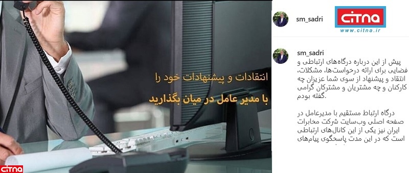 درگاه ارتباط مستقیم با مدیرعامل در صفحه اصلی وبسایت شرکت مخابرات ایران نیز یکی از این کانالهای ارتباطی است که در این مدت پاسخگوی پیامهای شما بوده و هست.