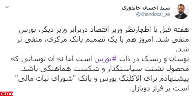 به گزارش سیتنا، احسان خاندوزی نایب رئیس کمیسیون اقتصادی در حساب توییتریاش نوشت: «هفته قبل با اظهارنظر وزیر اقتصاد در برابر وزیر دیگر، بورس منفی شد. امروز هم با یک تصمیم بانک مرکزی، منفی تر شد. نوسان و ریسک در ذات بورس است اما نه آن نوسانی که محصول تشتت سیاستگذار و شکست هماهنگی باشد. پیشنهادم برای الاکلنگ بورس و بانک "شورای ثبات مالی" است بر فراز دو بازار.»