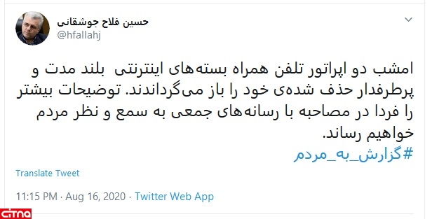 به گزارش سیتنا، حسین فلاح جوشقانی، معاون وزیر ارتباطات و رئیس سازمان تنظیم مقررات توئیت کرد: