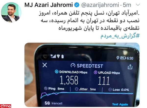 به گزارش سیتنا، آذری جهرمی با انتشار تصویری از تست سرعت ۱۳۵۸ مگابیتی شبکه 5G تلفن همراه ایرانسل در امیرآباد تهران در توییتر، نوشت: