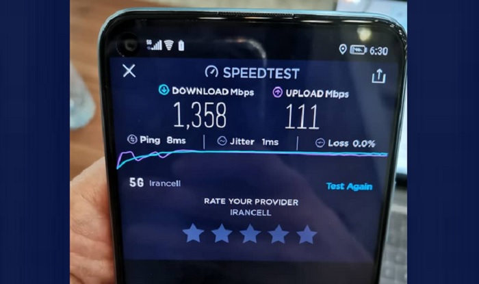 تست سرعت ۱۳۵۸ مگابیتی شبکهی 5G ایرانسل در امیرآباد تهران