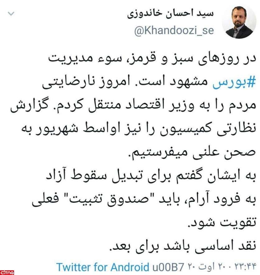 "در روزهای سبز و قرمز، سوءمدیریت بورس مشهود است. امروز نارضایتی مردم را به وزیر اقتصاد منتقل کردم. گزارش نظارتی کمیسیون را نیز اواسط شهریور به صحن علنی میفرستم.