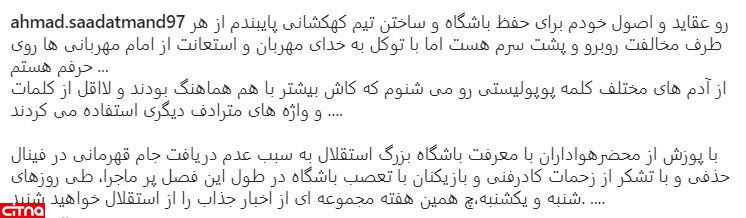 «رو عقاید و اصول خودم برای حفظ باشگاه و ساختن تیم کهکشانی پایبندم از هر طرف مخالفت روبرو و پشت سرم هست اما با توکل به خدای مهربان و استعانت از امام مهربانی ها روی حرفم هستم ...