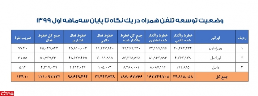 بر اساس این گزارش و تا پایان سال 98، تعداد خطوط واگذار شدهی همراه اول 92 میلیون و 462 هزار و تعداد مشترکان فعال این اپراتور 65 میلیون و 47 هزار، تعداد خطوط واگذار شدهی ایرانسل 86 میلیون و 325 هزار و تعداد مشترکان فعال این اپراتور 51 میلیون و 727 هزار و تعداد خطوط واگذار شدهی رایتل 8 میلیون و 280 هزار و تعداد مشترکان فعال این اپراتور 4 میلیون و 317 هزار است.