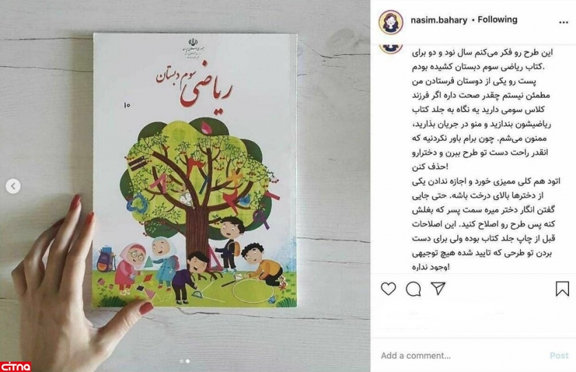 نسیم بهاری، طراح جلد کتاب ریاضی سوم دبستان که در چاپ سال ۹۹ دچار تغییر شده، با اعتراض به این اقدام، در پستی اینستاگرامی، توضیحاتی را ارائه داده است.