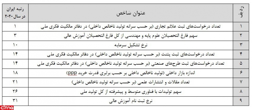 به گزارش سیتنا، گزارش سال 2020 شاخص جهانی نوآوری توسط سازمان بینالمللی مالکیت فکری که 12 شهریورماه سالجاری منتشر شد آمارهای تازهای از جایگاه ایران در میان تولیدکنندگان علم جهان به نمایش گذاشت. گزارش یاد شده با چارچوبی متوازن به ارزیابی 131 کشور میپردازد. ایران در بین 10 کشور منطقه آسیای میانه و جنوبی رتبه دوم را کسب کرده است.