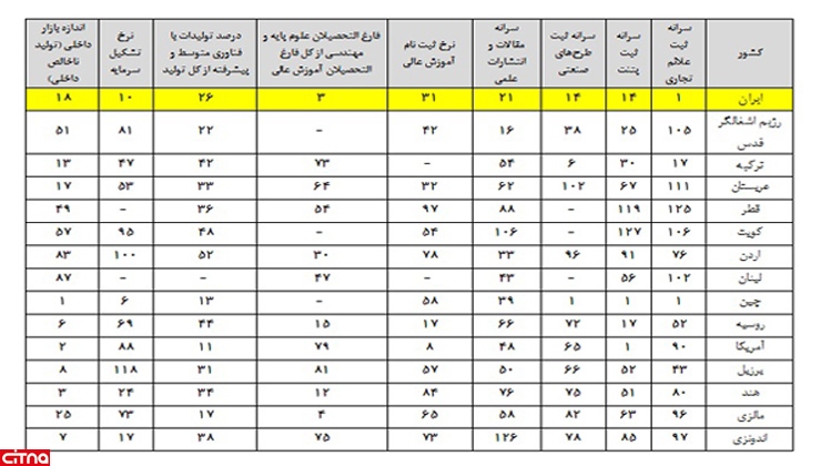 فهرست این شاخصها و رتبه ایران در آنها در جدول زیر ارائه شده است: