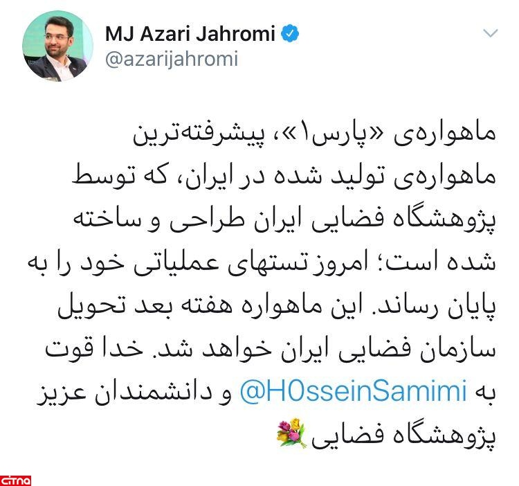 وزیر ارتباطات و فناوری اطلاعات، گفت: ماهوارهی «پارس۱» که توسط پژوهشگاه فضایی ایران طراحی و ساخته شده است؛ امروز تست های عملیاتی خود را به پایان رساند.