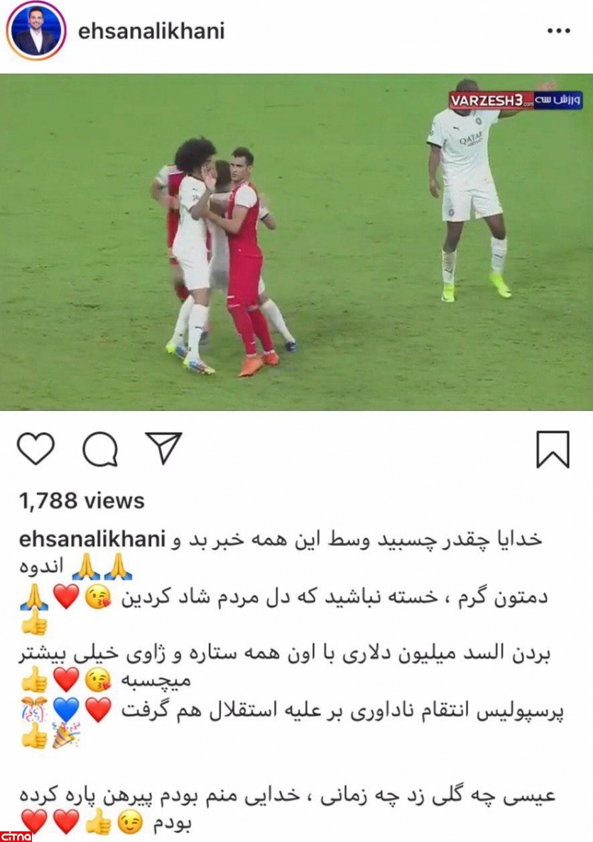 به گزارش سرویس وبگردی سیتنا، احسان علیخانی، مجری تلویزیون پس از پیروزی پرسپولیس برابر السد در صفحه اینستاگرام خود نوشت: