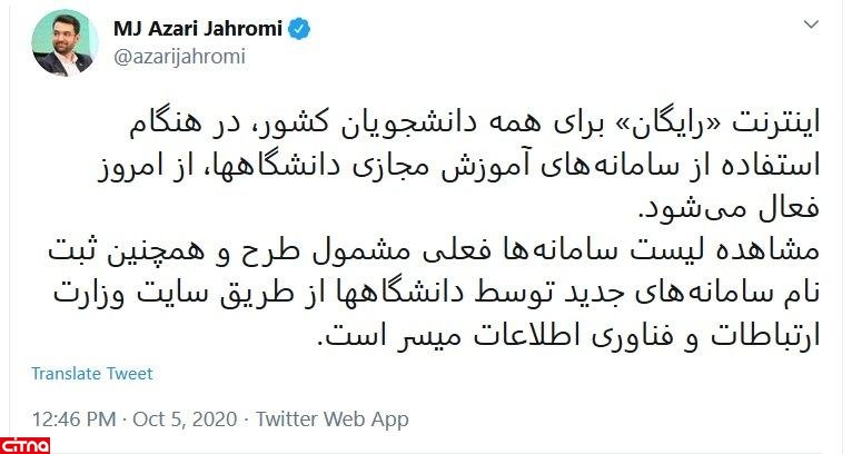 وزیر ارتباطات و فناوری اطلاعات، گفت: اینترنت «رایگان» برای همه دانشجویان کشور، در هنگام استفاده از سامانههای آموزش مجازی دانشگاه ها، از امروز فعال میشود.