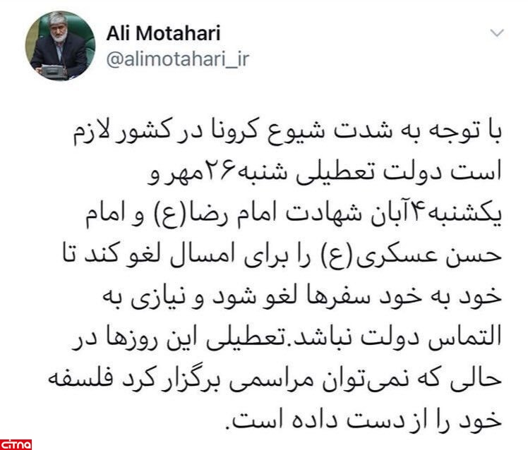 به گزارش سرویس وبگردی سیتنا، علی مطهری در توئیتی نوشت: با توجه به شدت شیوع کرونا در کشور لازم است دولت تعطیلی شنبه ۲۶ مهر و یکشنبه ۴ آبان شهادت امام رضا(ع) و امام حسن عسگری (ع) را برای امسال لغو کند تا خود به خود سفرها لغو شود و نیازی به التماس دولت نباشد. تعطیلی این روزها در حالی که نمی توان مراسمی برگزار کرد فلسفه خود را از دست داده است.