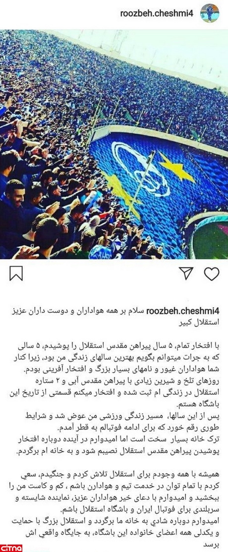 روزبه چشمی پس از جدایی از استقلال پیامی برای هواداران آبی در صفحه اینستاگرامش منتشر کرد.