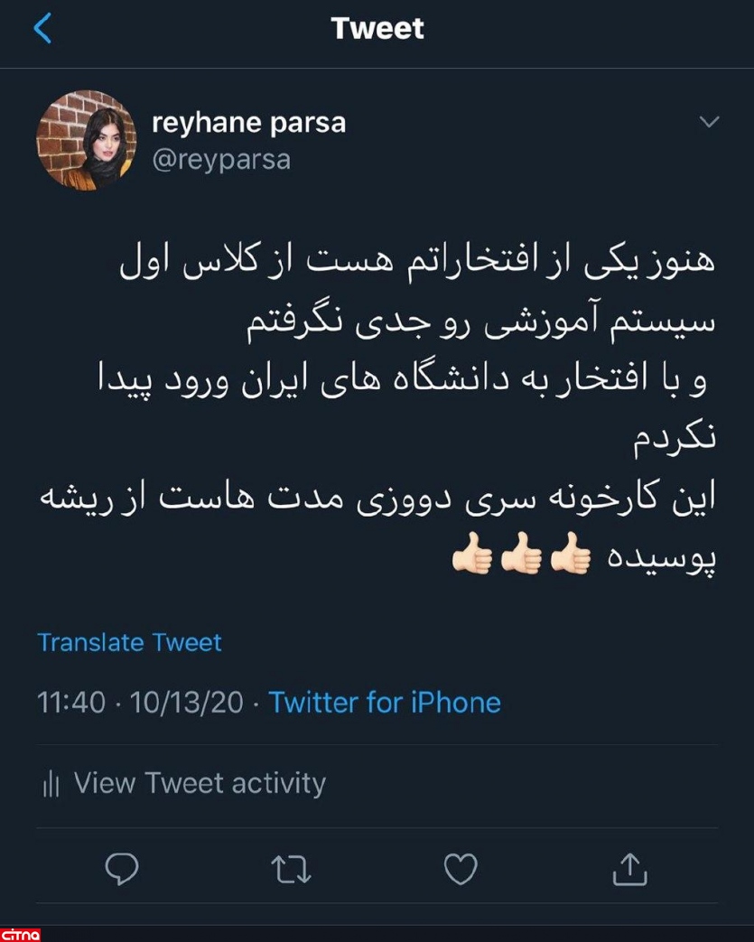 توییت تمسخر آمیز ریحانه پارسا برای سیستم آموزشی